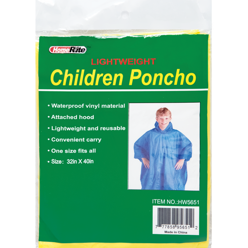 Product Description: HomeRite Children's Poncho is perfect to have for an unexpected rainstorm or for a camping trip. They can be easily stored in...